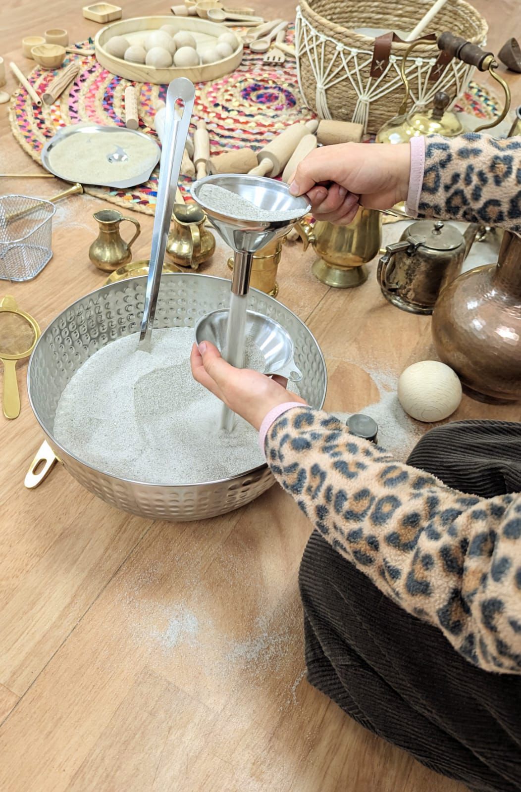 An den „Arbeitstischen“ findest du alles, was du brauchst: Siebe, Löffel, Kellen, Teekannen und Milchkännchen – und das alles aus echtem Holz und Metall. Ob im Stehen oder Sitzen, los geht’s!